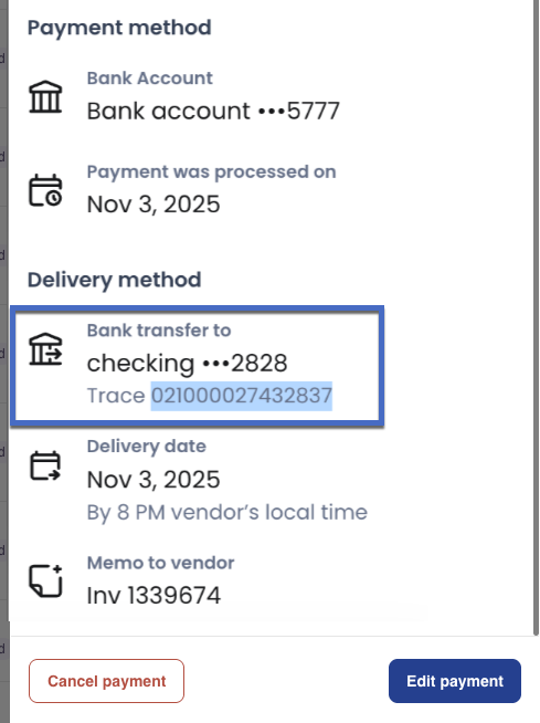 4- Scroll down to the Delivery method section. You'll find the trace number listed under the vendor's bank account details.