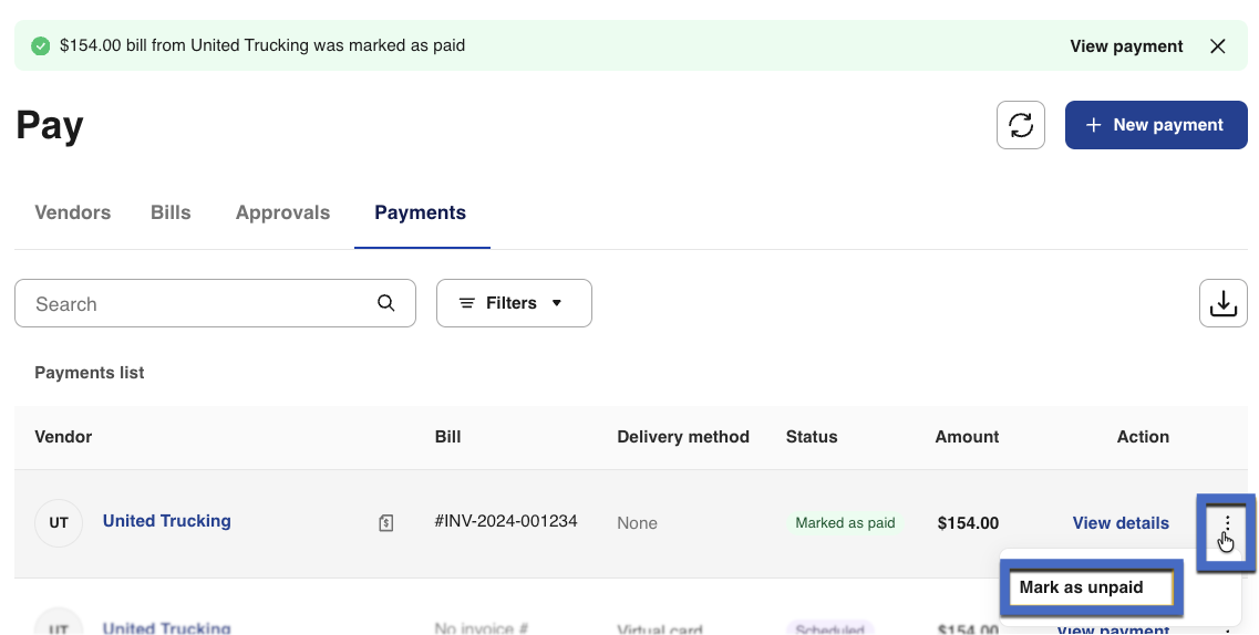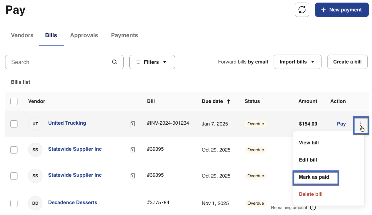 That's it! Your bill is labeled Marked as paid and moved to the Payments tab.