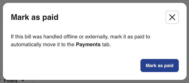 When you mark a bill as paid, it will move from the Bills tab to the Payments tab under the Paid sub-tab.