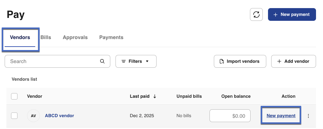 Alternatively, from the Vendors tab, find the vendor you would like to pay and select New Payment.