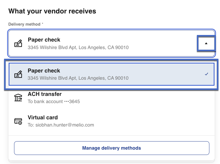 a. Use the dropdown menu to choose Paper Check from saved delivery methods.