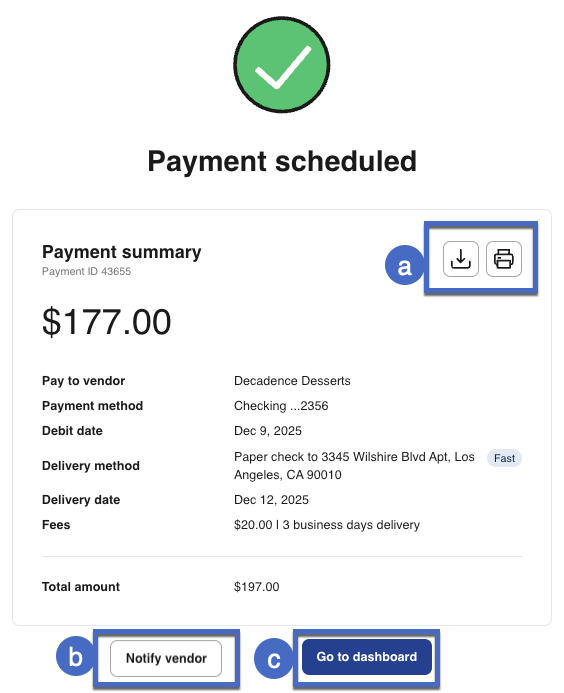 9- Your check payment is now successfully scheduled! From the success screen, you can: