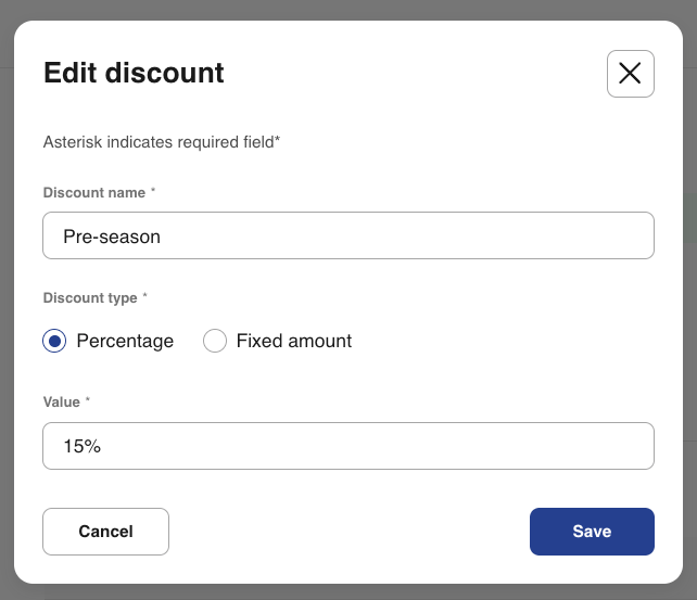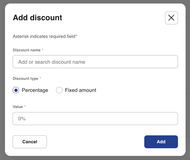 - Discount type: Choose between Percentage or Fixed amount.
