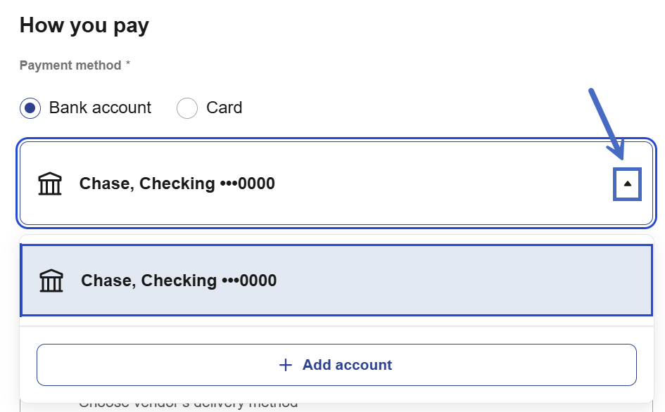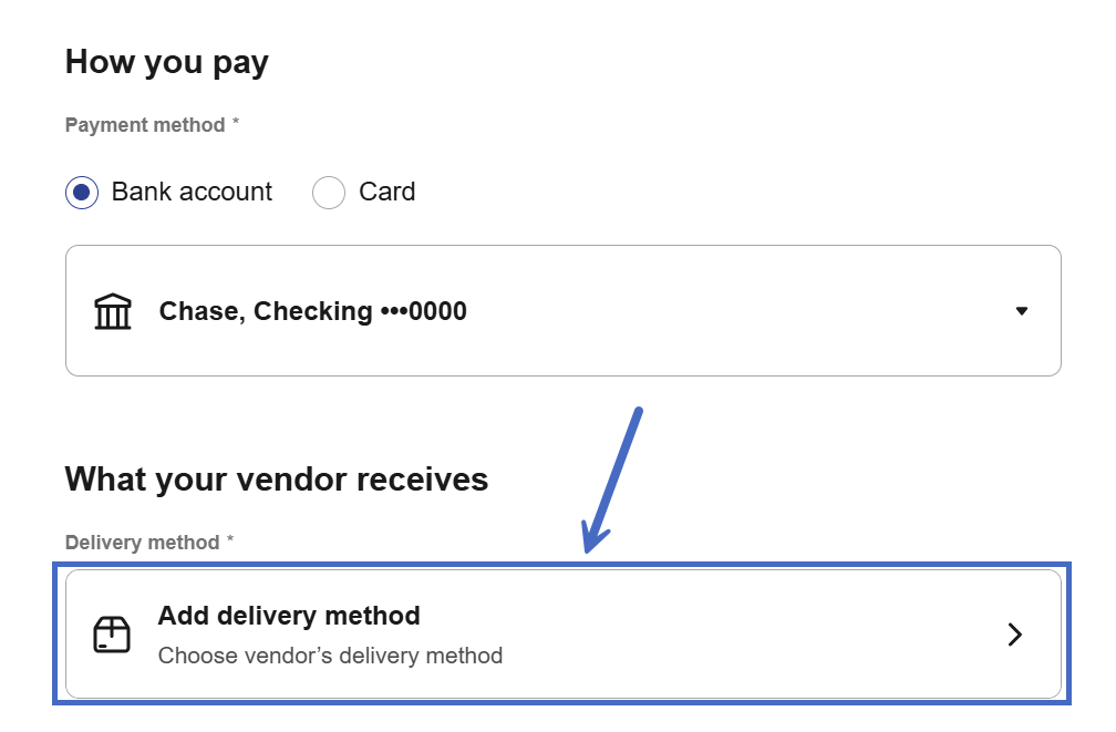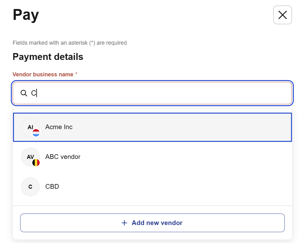 - For new vendors: Type the full business name and select + Add new vendor to create a new vendor profile.