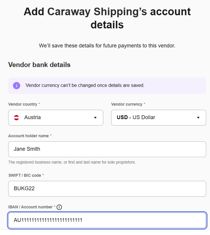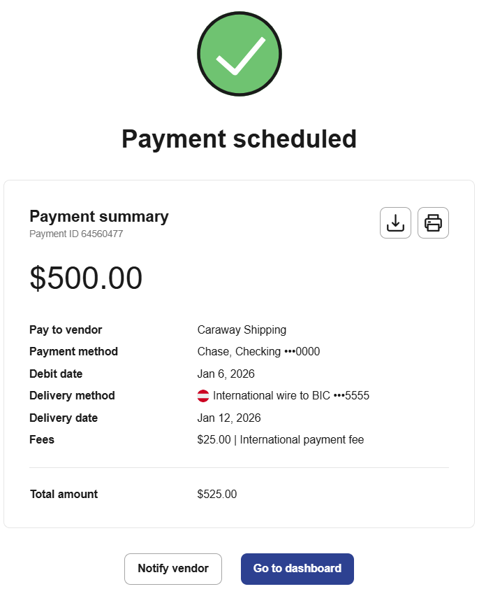 That's it! You've successfully scheduled an international bank transfer to your vendor. You can track the international bank transfer’s progress in the Payments tab.