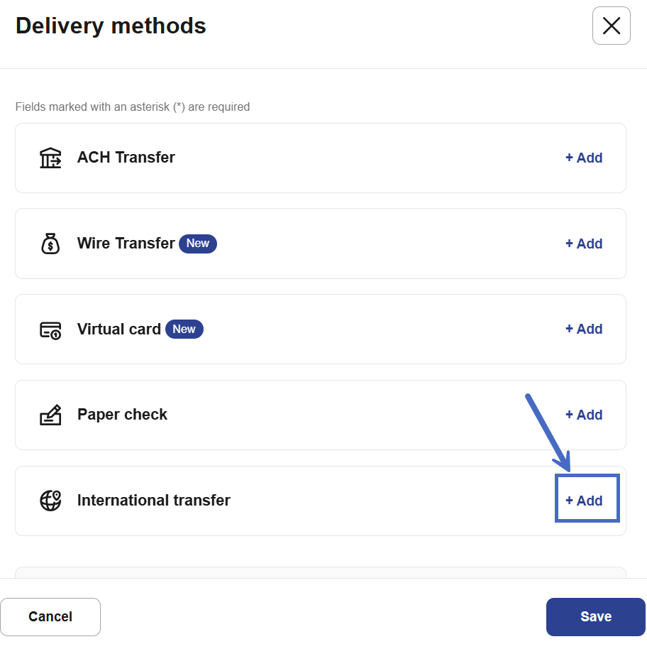 - Select +Add next to international transfer.
