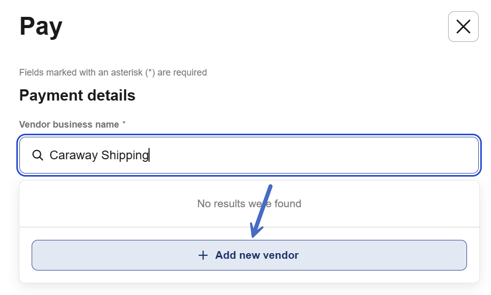 - For new vendors: Type the full business name and select + Add new vendor to create a new vendor profile.