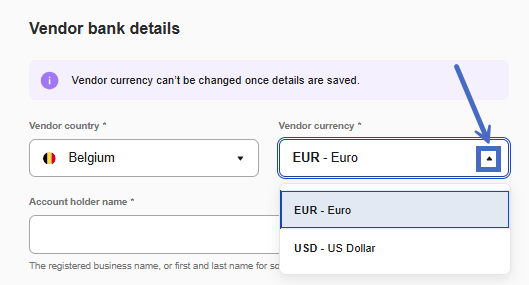 - Select the vendor’s local currency and enter the bank details.
