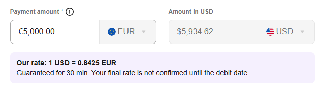 Both the USD amount that is deducted from your account and the amount in the foreign currency your vendor gets are clearly indicated.