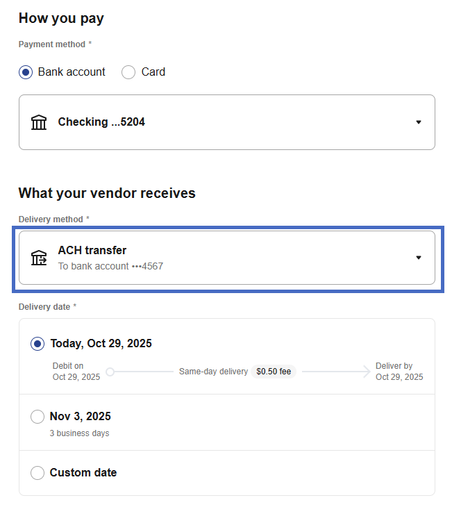 If you send your vendor a request asking how they'd like to receive payment, you can still complete the payment immediately - no need to wait for their reply. However, scheduled payments will be automatically canceled if the vendor doesn't respond within 7 business days. You can cancel the delivery method request anytime by editing the vendor details and selecting Cancel request.
