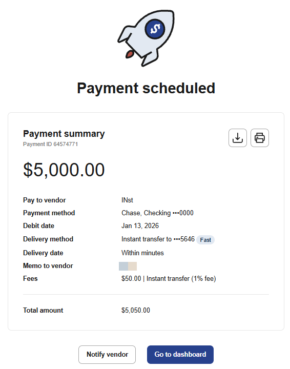 That's it! You've successfully created and scheduled a vendor payment. You can find your new payment in the Payments tab. Your payment details are saved, and funds will be delivered according to your selected timeline and method.